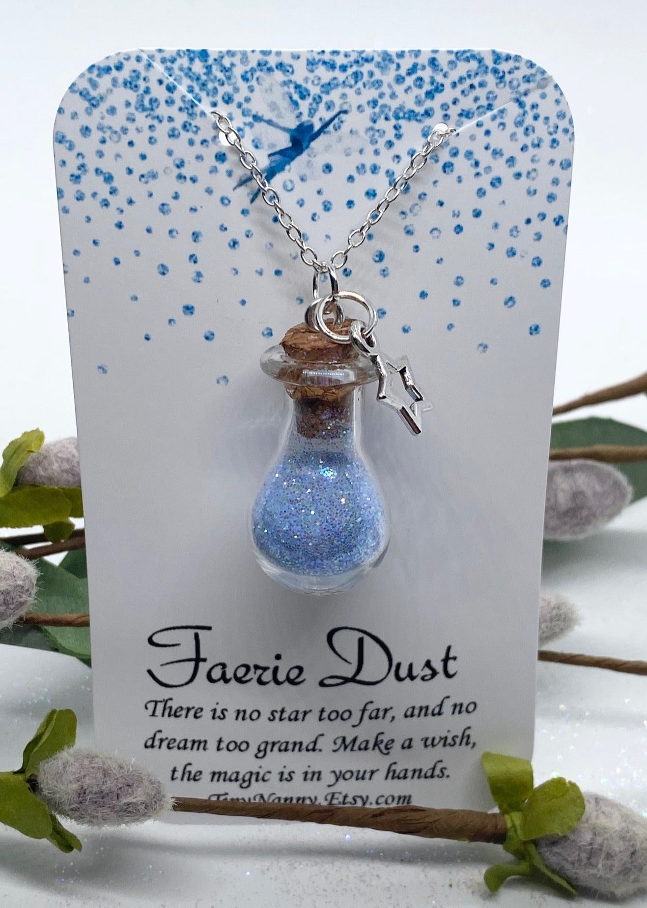 These adorable tiny glass bottles hold the magic that is faerie dust! This dust has been searched for to ensure the finest, most light reflective quality. Each cork is sealed shut using jewelry glue. Each tiny screw hook is set into the cork using resin to ensure long lasting durability. Necklaces are on an 18 inch chain with lobster claw clasp, and include a matching dangle star charm!