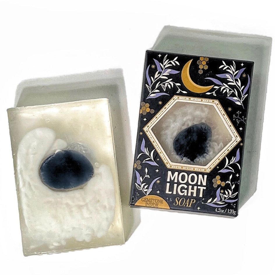 Illuminate your bath with the Moonlight Gemstone Bar Soap, infused with the warm, golden scent of honey and a hidden Obsidian gemstone for grounding and protection. This radiant soap invites deep calm, reflection, and renewal as you wash away the day’s energy.