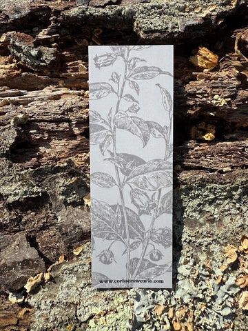 One non-sticky notepad with 50 sheets featuring queen of the night and datura flowers, both of which bloom at night. Measures 4.25 x 5.5" (10.4 x 13.9cm). Cardboard backing on back.