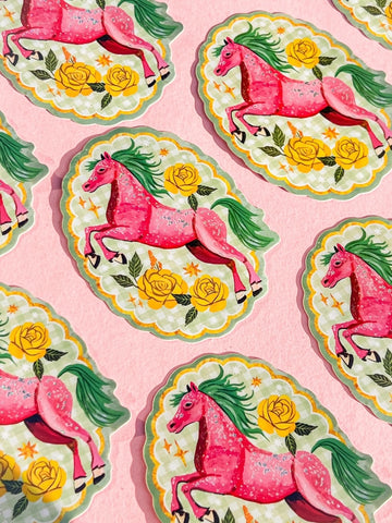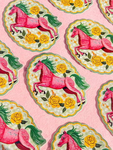 Adorn your laptop, cell phone case, notebook, car, or just about anything that might need a little extra beauty! This die-cut, glossy sticker measures 4″ x 3” and is printed at the highest quality! Glitter accents.