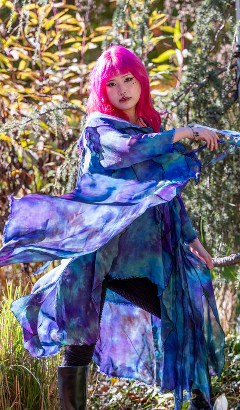 This artful fantasy duster that floats like a dancer, is hand dyed by artisan Erin Cassell in a painterly combination of deep cool purples, ocean teals, and night forest greens. It is lovingly sewn by studio artists in Maryland with hand cut and free form details.