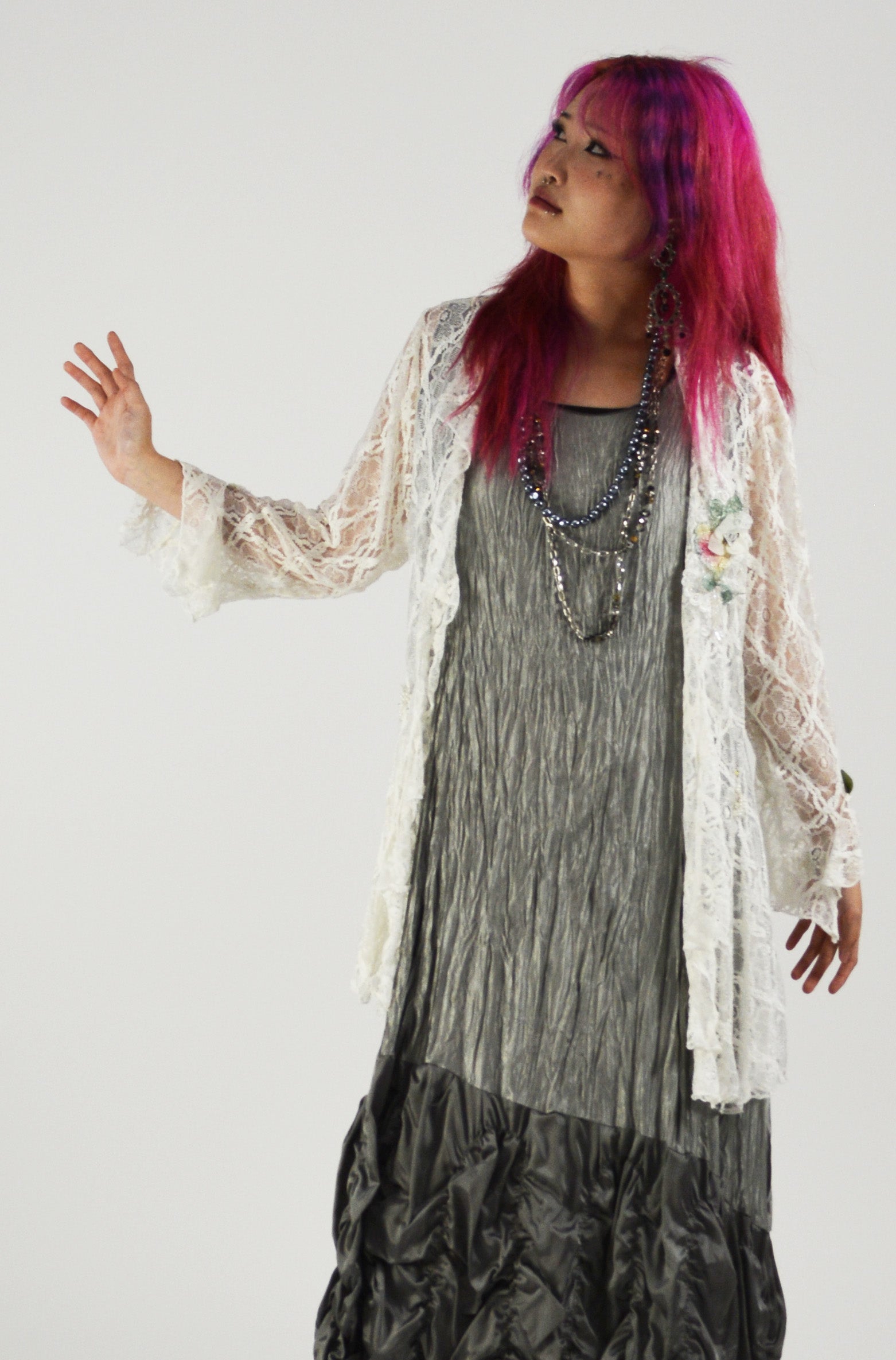 This soft floaty feminine airy jacket with a gently waving lapel is romantic and compliment- worthy, as well as comfortable and travel-friendly. The White Tilly has a body of textured lace in a diamond pattern. Five different combinations of decorations appear on the garment. Delicate clusters of white pearls and delicate mint colored velvet leaves appear at the tops of the inserts. The special focus decoration on the soft waving lapels has five artfully places components- white re-embroidered lace with fine cording, delicate three- dimensional translucent flower petals anchored with a tiny silver metal rose with tiny deep sage green ribbon leaves, hanging crystals and a leaf and flower applique hand dyed in a pale gold and green with a pop of pink. The applique is outlined in fine silver metallic cording. The back insert is decorated with a white silk chiffon ruffle, a white velvet flower with beaded highlights and dangling pale sage textured ribbons.